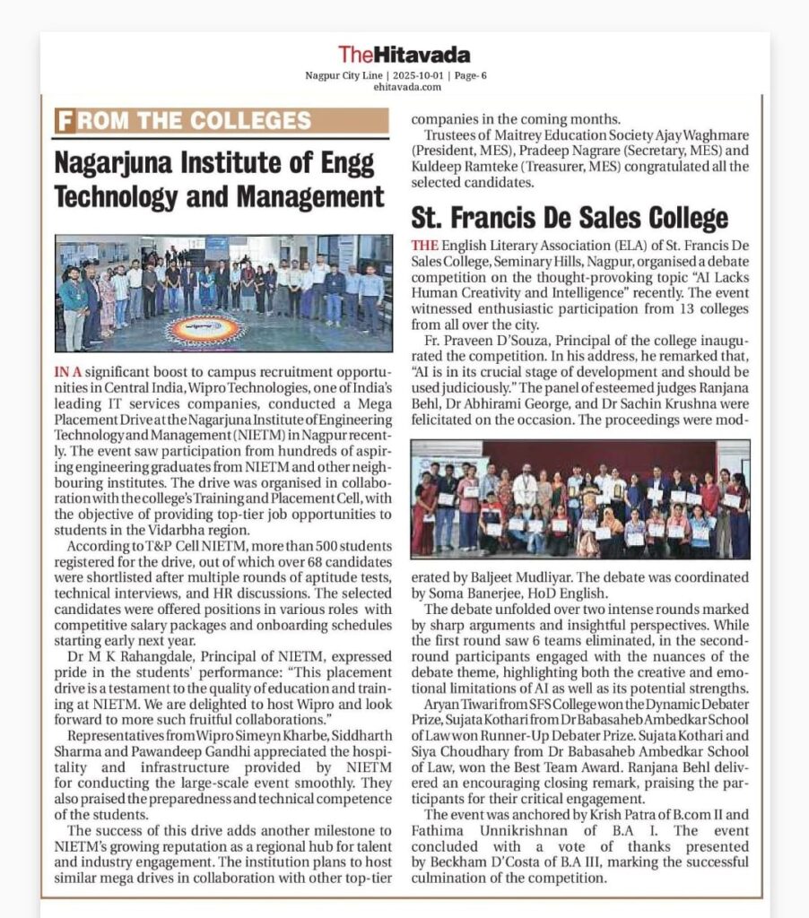 In a significant boost to campus recruitment opportunities in Central India, Wipro Technologies, one of India’s leading IT services companies, conducted a Mega Placement Drive at the Nagarjuna Institute of Engineering Technology and Management (NIETM) in Nagpur this week.